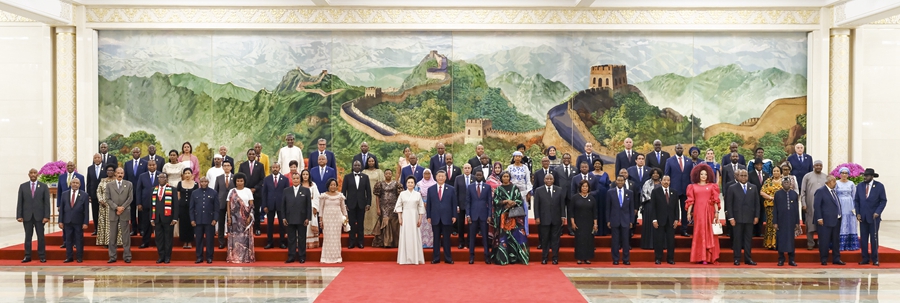 9月4日晚,国家主席习近平和夫人彭丽媛在北京人民大会堂举行宴会,欢迎来华出席中非合作论坛北京峰会的非方及国际贵宾。这是宴会前,习近平和彭丽媛同贵宾们集体合影留念。新华社记者丁林摄