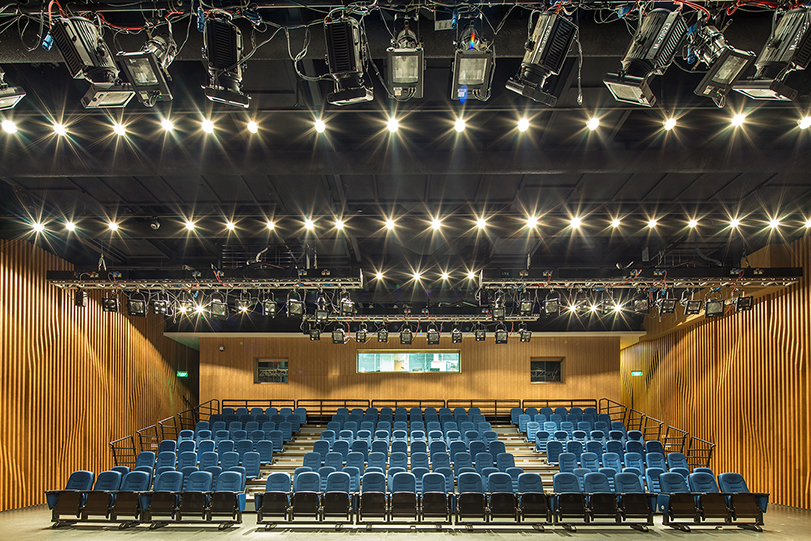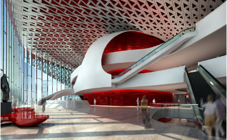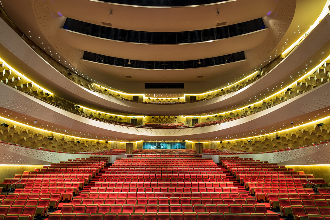 剧院外形独特彰显浓郁海派特色及闽南韵味,银白色三角镂空外墙下映衬着活跃的红,半开放式的玻璃幕墙增强了剧场的采光效果及建筑空间感。剧场内红白两大主色形成强烈对比,营造出热烈喜庆的氛围,随处可见的流线型设计,勾勒出优美的弧线,既有现代主义的抽象又让人联想起海上奔腾的波浪,视觉上给人带来全新体验。