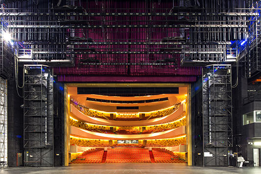大剧场金色大厅内“鞋盒式”布局的观众席可容纳1501人。剧场内部的设计、用材,充分考虑建筑声学,混响时间达到国际标准的1.6秒。主舞台采用国际上通行的“品”字形舞台,舞台机械、灯光、音响系统等设备均按照国内一流标准配置。能够承接国内高水平的大型歌剧、舞剧、大型综艺晚会的演出并兼顾交响乐、室内乐、合唱等演出和会议的需要,具备承接国际演出团体演出的基本功能和条件。